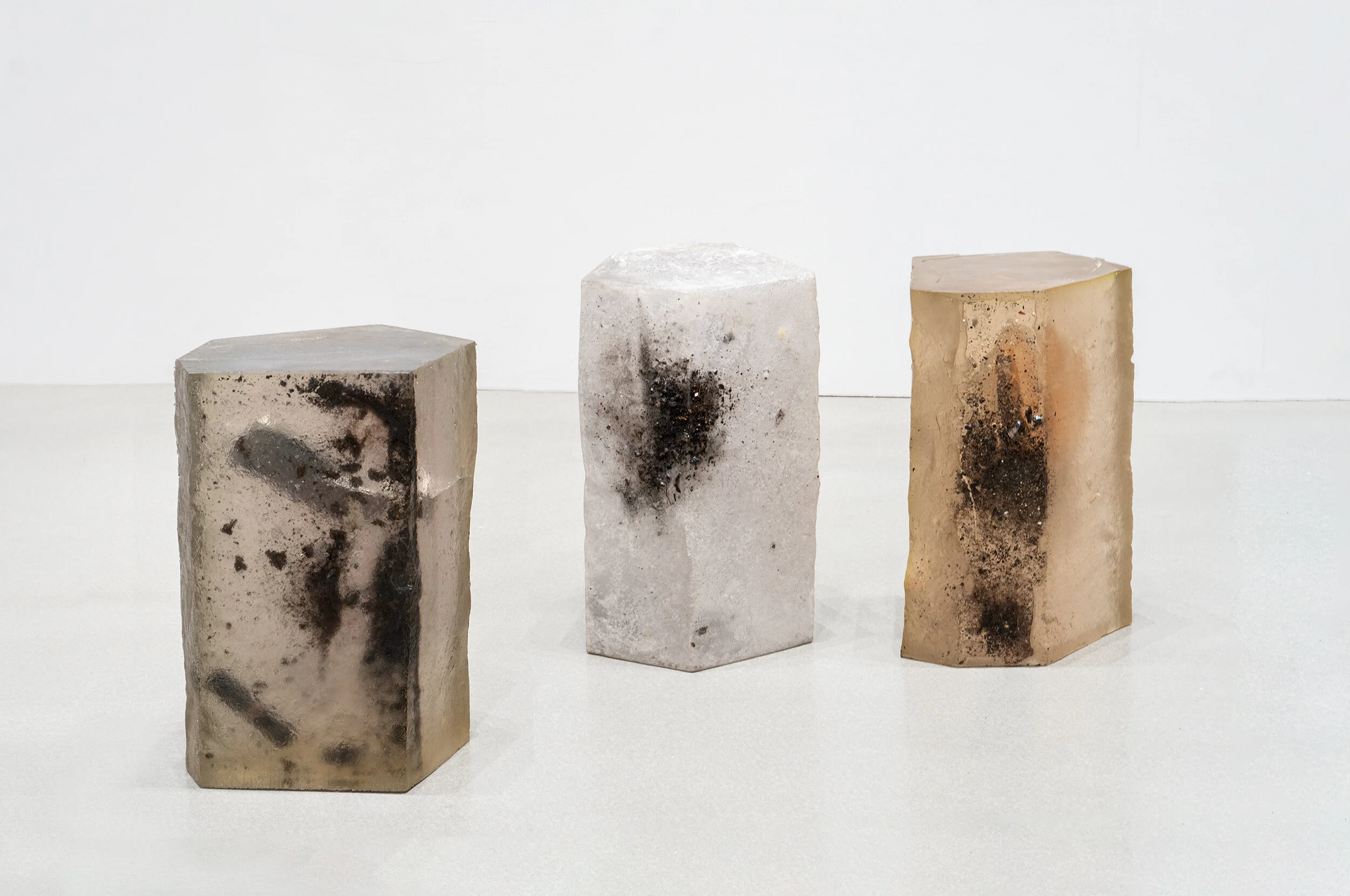 It would be easy for a conceptual description of the work to neglect its striking beauty. The objects lying frozen within their cloudy masses are only partially visible. Items are at once preserved and distorted by the volcanic shape, which functions simultaneously as artwork and plinth. Numerous works can be stacked on top of each other to create a unique and formidable totem that contains the past and present with an eye toward the future. Both visually nebulous and inflexibly archival, these are time capsules that subtly embody the mystery of the circumstances that might find them. The natural world, though indelibly affected by its human constituents, will survive our impact and continue to evolve.