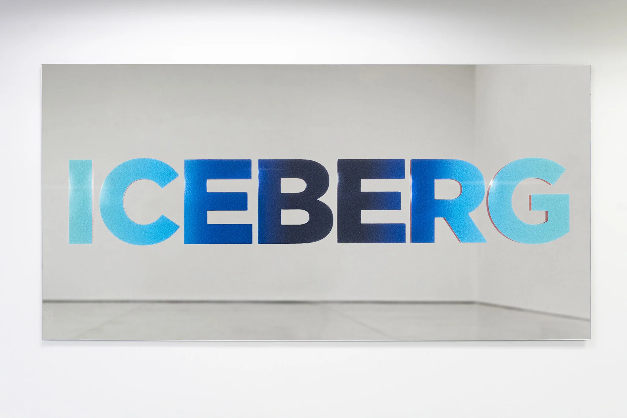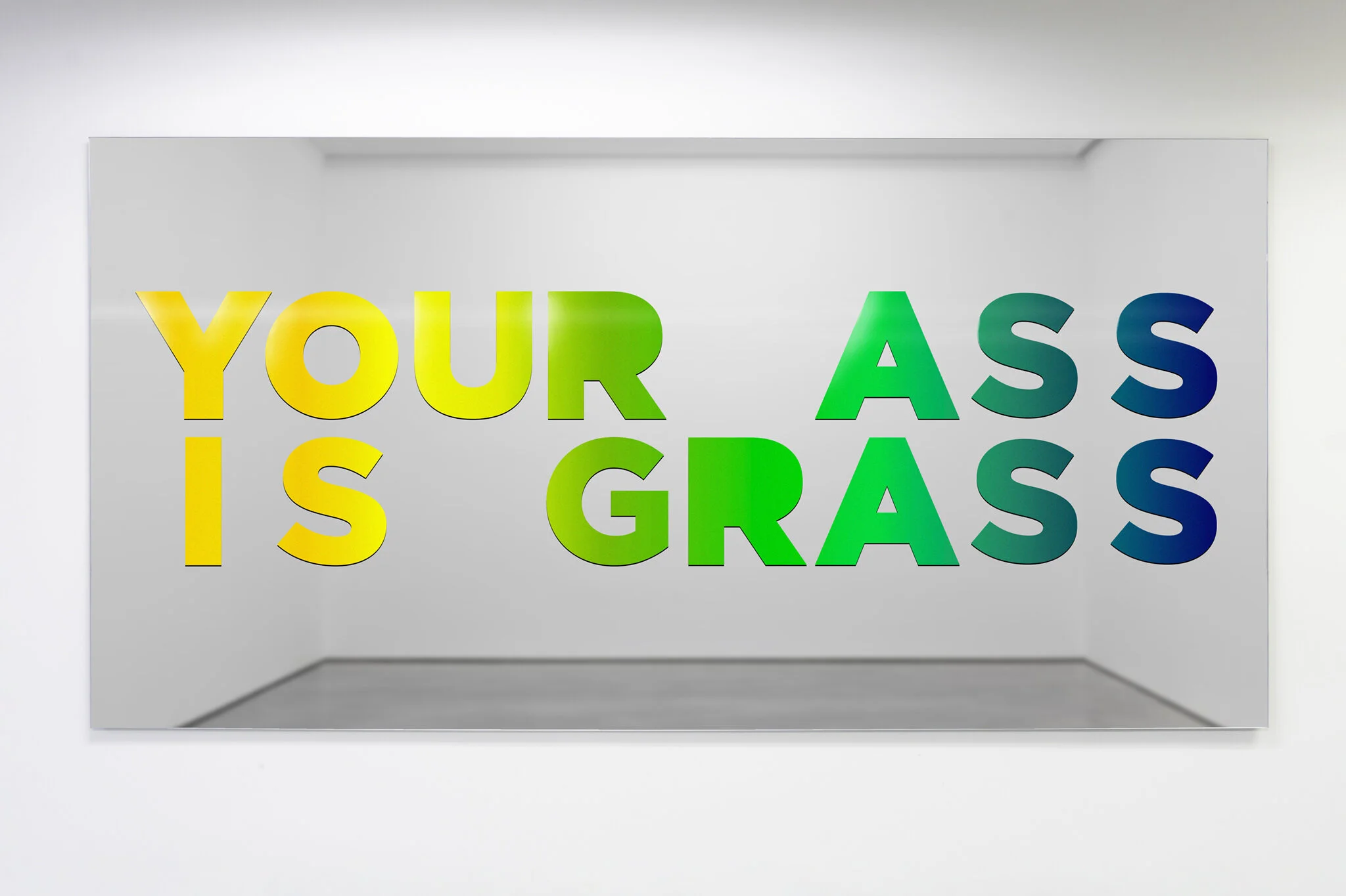 Reflecting––both literally and figuratively––a narrative of chaos and convolution, Your Ass Is Grass traces socio-ecological events with perspicacity and playfulness. The series is comprised of brightly colored, multi-layered paintings on mirror. Combining spectrums of colors in horizontal gradients with what Rogers calls an obscured peripheral shadow, visible only upon an angled view, the series conflates text as image to powerful effect.