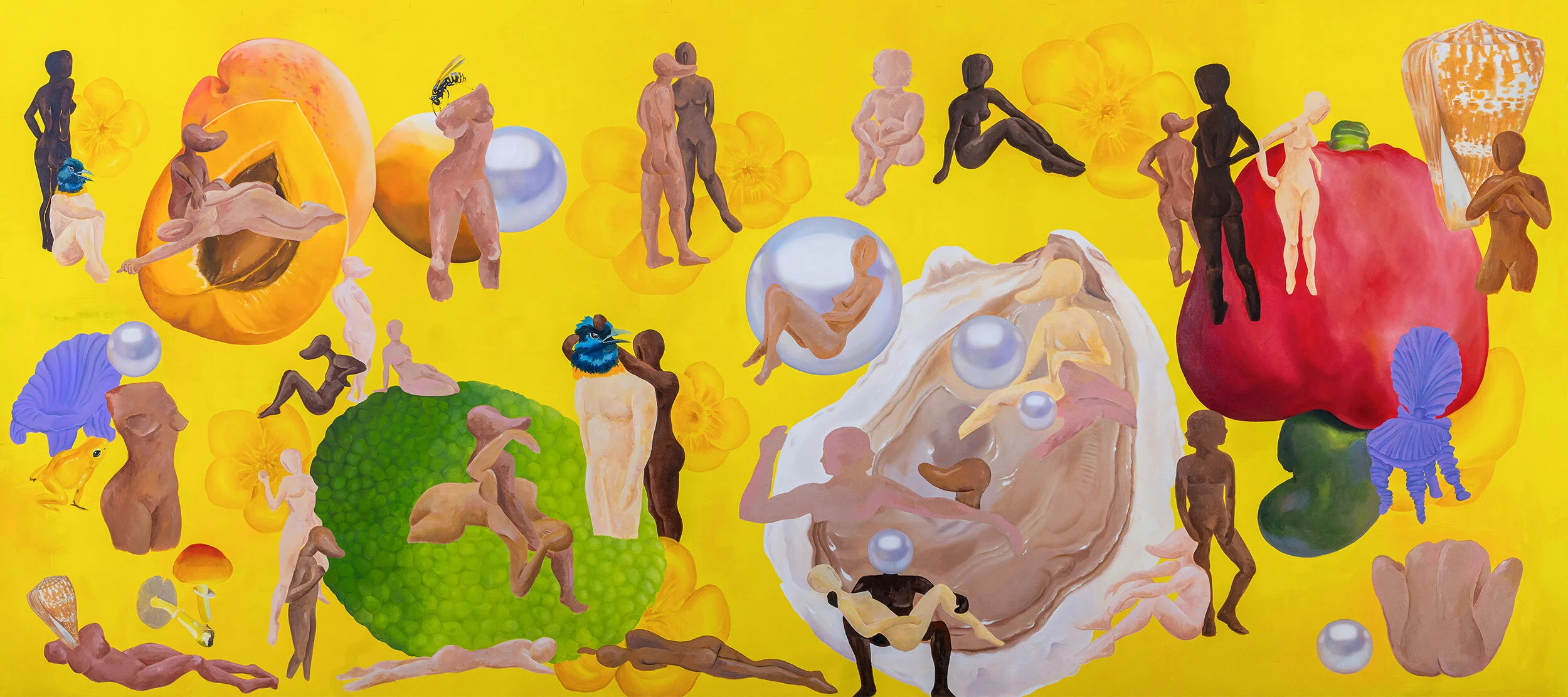 Aesthetically redolent of the vibrant, imaginative world-building of Hieronymus Bosch, The World Is Your Oyster conjures a wonderland of contradictions. Even the dominant color, a reinvention of chrome yellow pigment––a highly toxic favorite of Van Gogh’s––has historically been used to signal both danger and the divine, and was once culturally heralded as the color ‘associated with all that was bizarre and queer in art and life.’ Encapsulating a myriad of perceptions, The World Is Your Oyster invites the viewer to a world at once edenic and bewildering, rife with things that fester and flourish, harm and delight––a garden of light and beauty that might very well kill you.