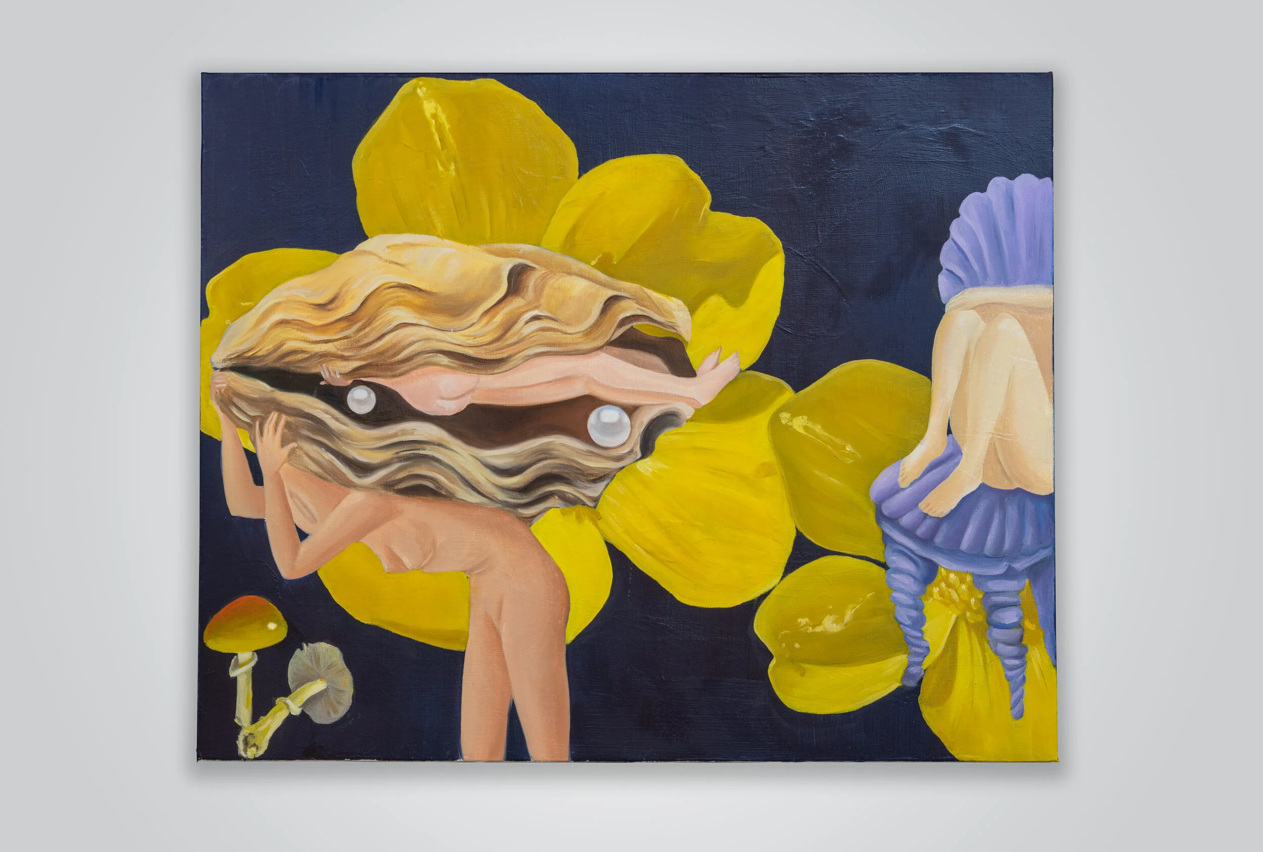In the vivid sprawl between the two grotto chairs, the pearl alternately serves as an absorptive presence, a surface for lounging, a recurring object that appears to have been either delicately placed or casually strewn, and hovering above a Venus-like torso in lieu of a head. The span of the painting itself seems to exemplify the interstitial locus inhabited by shells and pearls, an area that is neither life nor death, ocean nor land: a richly shifting present between varied histories and imagined futures.